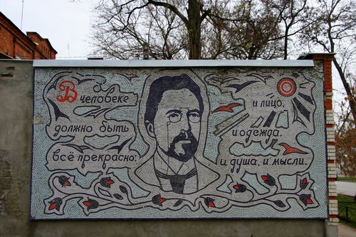 В городе много мест, имеющих отношение к Чехову и его семье. Я питаю слабость к советским мозаикам, поэтому вот Вам фото одной из них: