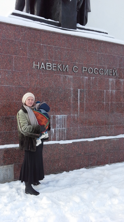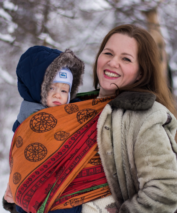 Теперь о самом слинге. Именно благодаря ему, я поняла значение слова "цепкость" слинга. Мне он показался именно таким - очень цепким. Так как на мой сегодняшний 50 -какой-то-(лучше не говорить об этом вслух))) КНК завязывается только с узлом сзади, то мне пришлось сделать только один узел, чтобы шуба не топорщилась. И да! он прекрасно держал на одном узле почти два часа!Спина у меня тоже не устала, правда и вес пассажира всего 8 кг. 700 гр. Не могу сказать, что мне было легко его намотать, думаю, все из-за этой его цепкости, ведь надевала я его на свитер, который тоже препятствовал скольжению. Метка середины, которая была всего одна, тоже заставила повозиться. Что касается расцветки, то вживую она мне понравилась гораздо больше, чем на фото. К тому же на фоне белого снега он смотрелся еще ярче. Мне тоже показалось, что этот слинг больше подойдет для деток постарше и все же для прохладного времени года.