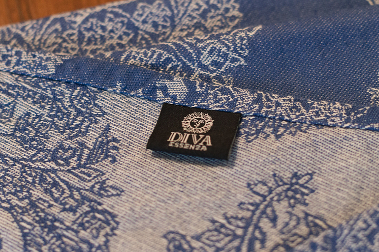 Подшит на одну сторону - лицо синее. Но шарф контрастный, так что можно носить по-разному. Метка середины вшита в край, в отличие от Дивы Милано. Мне это больше понравилось, т.к. с моими кривыми руками я ее постоянно норовлю оторвать. Но она одна. Это неудобно, т.к. по закону подлости она всегда оказывается внизу.