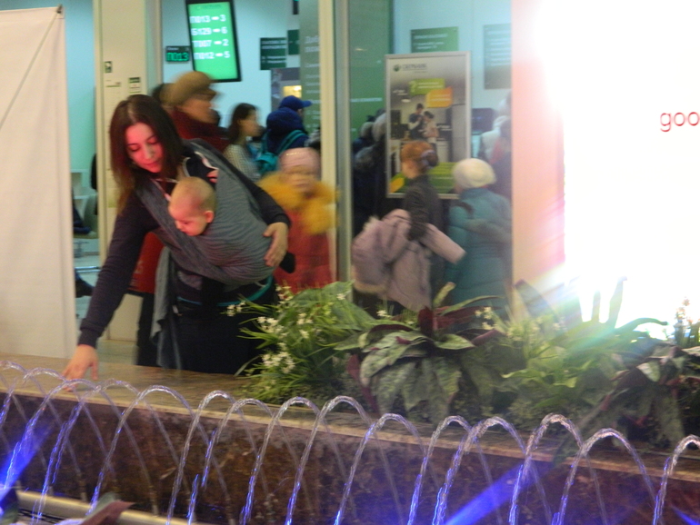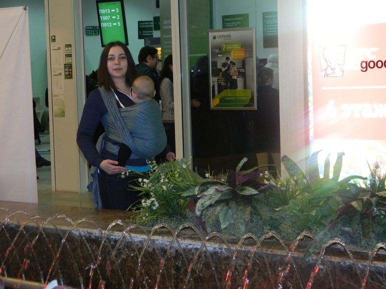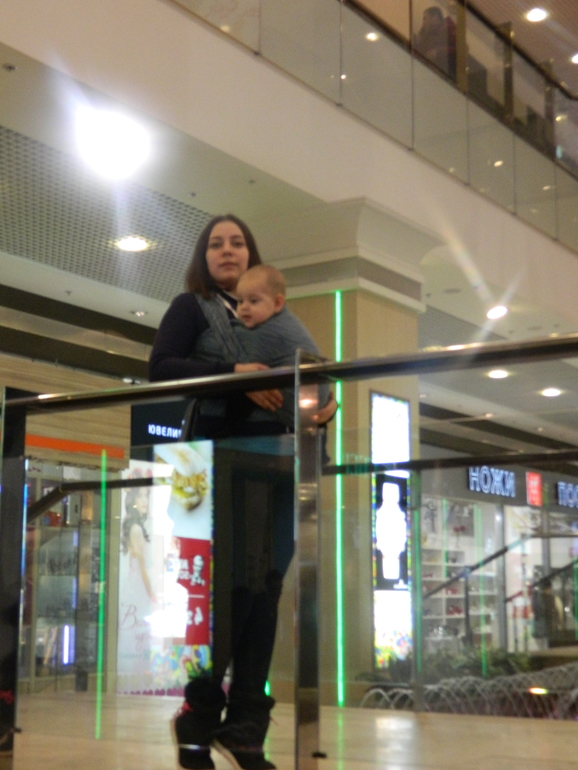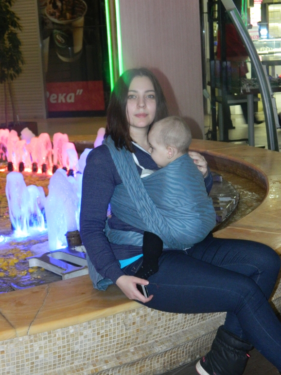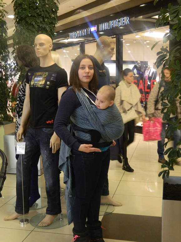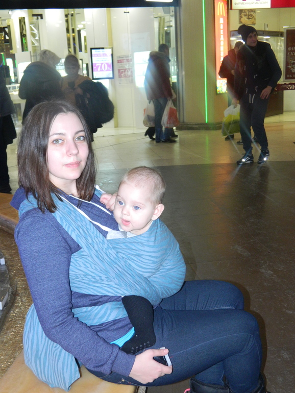 Шарф приятного, милого, спокойного цвета. Серые полосы создают впечатление, что он шелковый, но он 100% хлопок и просто мягкий и приятный на ощупь. Для младенчиков конечно грубоват. Шарф со своими задачами справился. За два часа прогулки по магазинам моя спина не устала, а Глеб и выспался, и поел, и рассмотрел прохожих вместе с местными достопримечательностями. Слинг было удобно подтянуть, развязать, чтобы выпустить ребенка, а так же посадить его обратно через время.