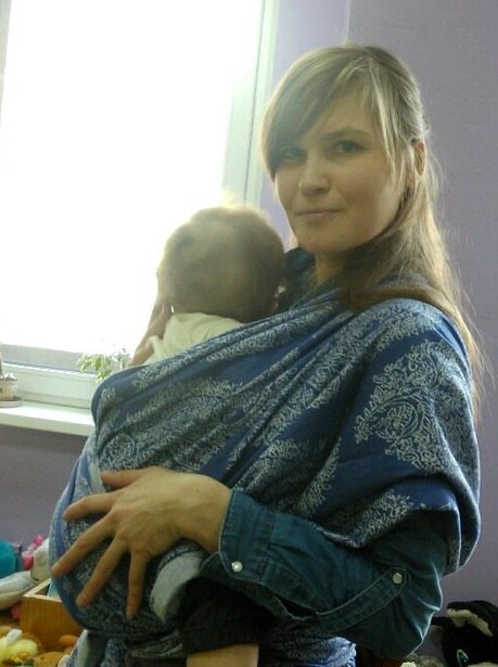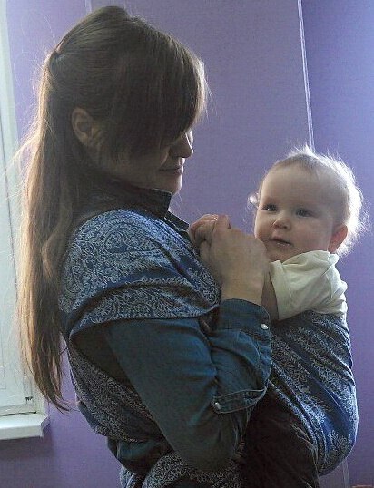 Мы уже перешли на майслинг Зара хлопковый, после него кажется этот шарфик просто марлечкой тонкой. Однако намотку держит довольно таки хорошо, но долго носить будет все таки тяжело на первый взгляд. Шарф не очень скользкий, час моя спина выдержала хорошо)