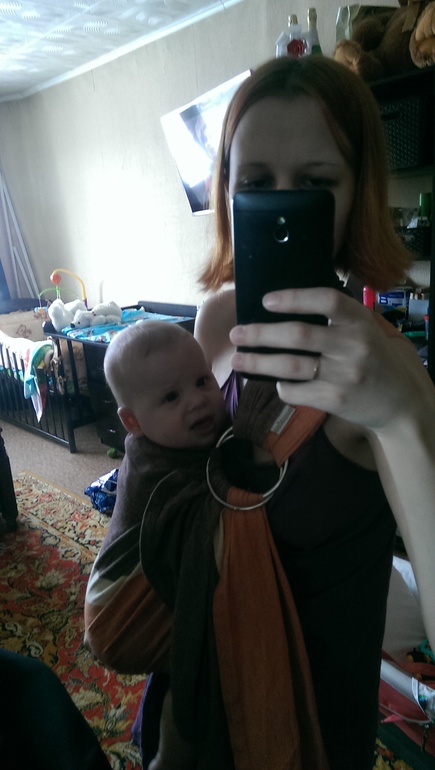 Ребенок должен сидеть чуть выше. Нижняя точка попы ребенка должна быть на уровне вашего пупка. Сверху слишком много ткани. Когда натягиваете ткань слинга на спину ребенка, в вашем возрасте ткань надо натягивать только до плеч, формировать валик вам уже незачем )). Когда вы посадите ребенка выше, то верхний край слинга как раз будет проходить по его плечам, а не по верху шеи, как сейчас. И на спинке ткань натягивайте плотнее.