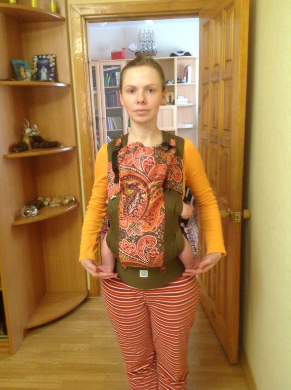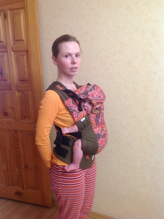 Следите за тем, чтобы внутренняя часть пояса не сминалась.Плотность притяжения малыша должна быть комфортной обоим, Вы должны свободно дышать.В конце посадки возьмите малыша за голени и чуть сведите ножки (колени) вместе для коррекции посадки.Ничего критичного в посадке нет. Подголовник, на мой взгляд, предпочтительнее использовать, как валик под шеей. Так обзор личика малыша намного лучше.