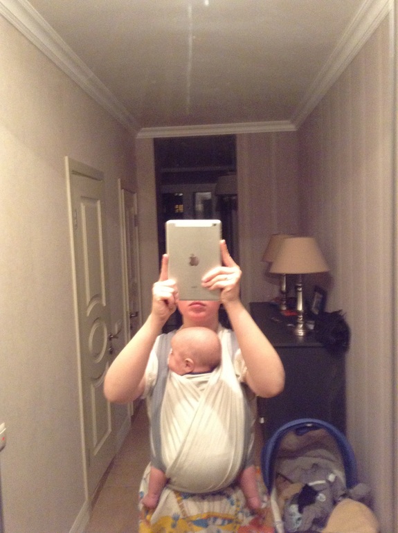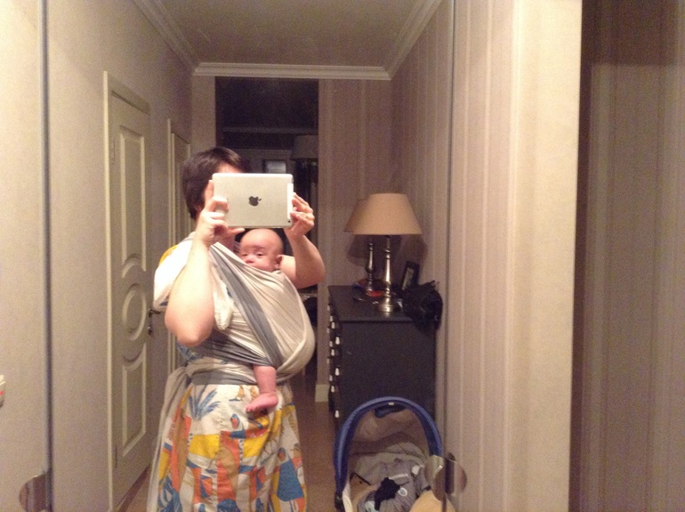 Ребенок не сидит, но карман нужно делать глубокий, заправляя всю нижнюю треть между собой и малышом, и расправлять полотна с плеч только по бедрам малыша, а не по спинке.