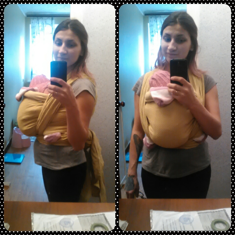 Учимся носитьучусь заматывать свою малышку, малявочек немного страшнее заматывать первые разы, чем сына, тогда и шарф был разношенней и мягче и начинали с более старшего возраста.. но вроде приловчилась уже.. пс.вижу,на фото кажется что одна нога уехала куда то не особо симметрично