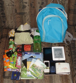 несколько авосек, зарядка, перекус (вкуснейшие флакс-батоны на меду и фрутиладки), вода (500 мл), ежедневник (А5, на кольцах), карты (у меня топографический критинизм ия могу легко заблудится, поэтому они всегда с собой), паспорт, два блокнотика, ручка, читалка, планшет, два телефона (рабочий и личный), кошелек, зеркальце, пластырь, крем, резинка для волос и фаст-слинг.