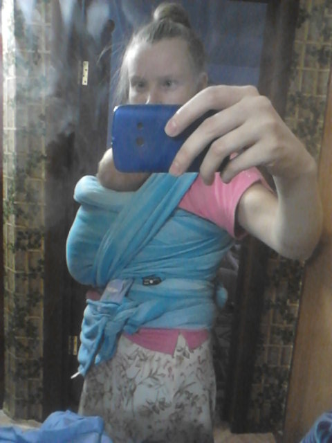 Я его у местного слингоконсультанта, можно сказать, выпросила, как увидела — влюбилась. Среднюю носила в коротком, кстати тоже дидимос, акваволны, там особо не заморачивалась, карман сверху полотна и узел на плече у меня, я шарфами уже на 28й недели заинтересовалась, так что живот был уже хороший, а рюкзак был уже не вариант носить. А вот длинные проблематичнее освоить оказалось.