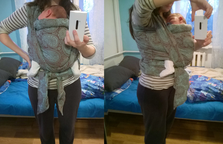 На мой взгляд не консультанта, а просто носящей мамы всё неплохо, можно просто за голени взять и ножки чуть свести в кучку, чтоб попа от вас отставилась немного и торчала дальше плечиков при взгляде в профиль. Если вы флисовую кофту себе не надеваете, то лялька сварится в флисовом слипе. Если боитесь, что замерзнет спинка, то можно кофточку, можно даже не застегивать, чтоб только спинку прикрывала. Мы ходим в колготках, боди, кофточке и шерстяных носочках, ну и шапка, конечно. У нас +5. Слингокуртка плащевка+флис. В +10 носки и кофту перестанем носить, и шапку сменим. Колготки удобны тем, что тянутся и не давят на пальчики, а боди — тем, что не задирается в процессе намотки.