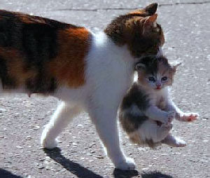 Как только кошка берет котенка за холку - тот сразу же начинает успокаиваться, и затихает окончательно, когда мать начинает перемещаться, держа его в зубах. Причём учёные обнаружили, что у котят даже снижалась частота пульса, а поведение становилось спокойным за очень короткий период, порой уже через две-три секунды. Одновременно котята принимали хорошо известную всем позу эмбриона, обвисая в зубах матери и потягивая лапы к туловищу.