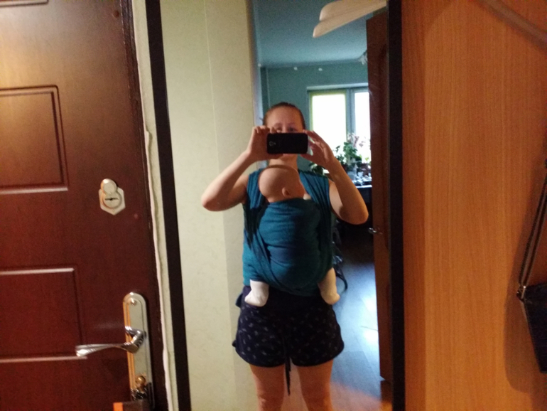такой лапушка милый..... я вся в восторге от вас)))))что можно посоветовать — можно слинг регулировать уже после того как закончена намотка — и это с такими активными детками даже удобнее....вот тут хорошо рассказывается как подтягиватьещё я бы вам советовала вешать слингобусы или яркий платочек,чтобы максимально привлекать внимание малыша на себя а не на пол))))так же можно сделать малышочку обзор больше в намотках на боку или бедре, как я понимаю — ему просто интересно смотреть по сторонам)
