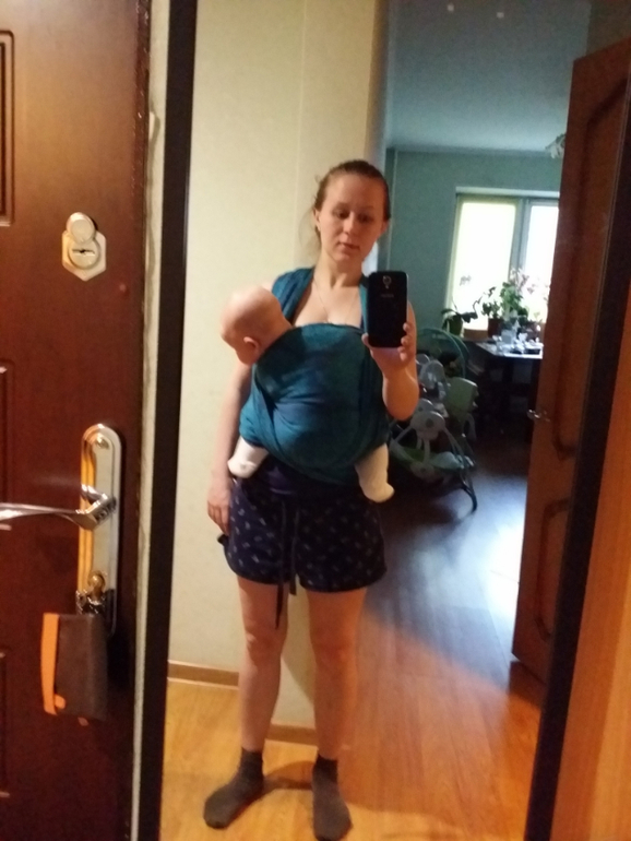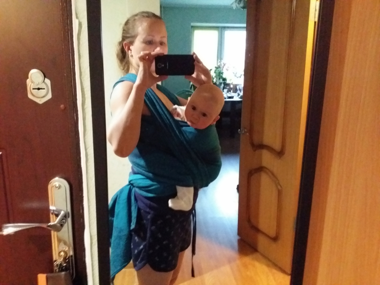 Купила я себе наконец шарфик, красивый, ммм (сначала долго выбирала какой, а потом долго выбирала цвет, у Дивы такие красивые). Учусь, никак не научусь :) Посмотрите, пожалуйста. Вроде хорошо натягиваю, но ребенок все равно на бок кренится, это значит я слабо затягиваю?