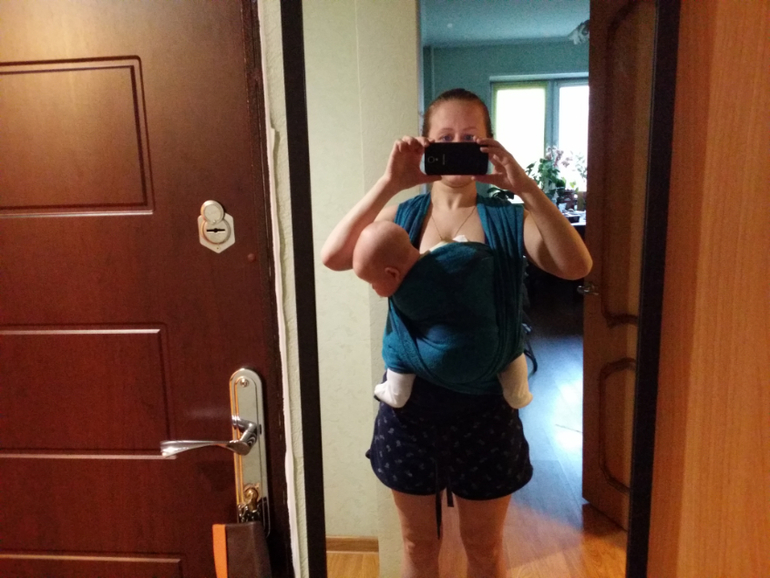 Возраст еще такой — любопытный) Начинается активное изучение окружающего мира) можно делать намотки на боку, чтоб больше видно ему было. Скоро тепло, и на улицу так можно. Если ребенок у меня наклонялся в одну сторону, то выправляла перед зеркалом, чтоб сидел ровно — сразу видно, где свободная ткань недотянутая образовалась, и всю эту слабину перегонять по всей намотке до узла.