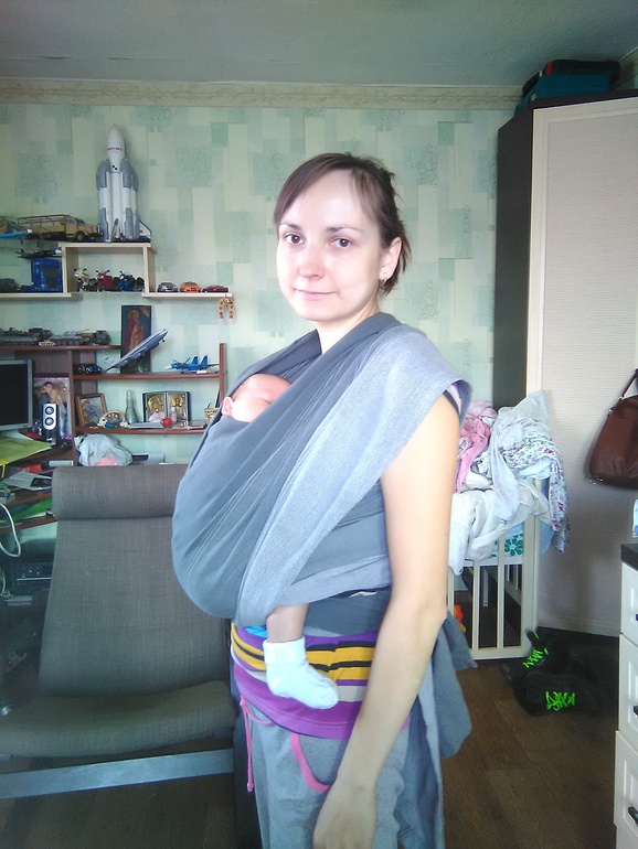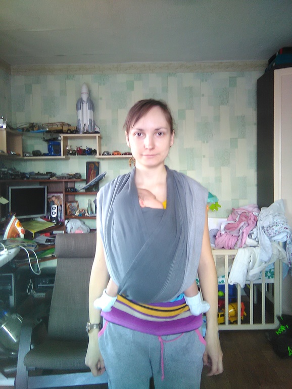 Писала выше: "Для новорожденного лучше организовать однослойную намотку, чтобы не было переразведения ножек"Уточняю: у маленького малыша короткое бедро, и обычно хороший тонус мышц. Он группируется, поджимая колени к животику — это положение напоминает положение на корточках. Коленочки будут упираться в родителя.Обычно 3-слойная намотка с новорожденным дает переразведение ножек, за счет чего таз сплющивается, ножки разводятся на некомфортный для малыша угол, и ножки становятся невертикальными от коленей и ниже.