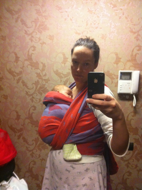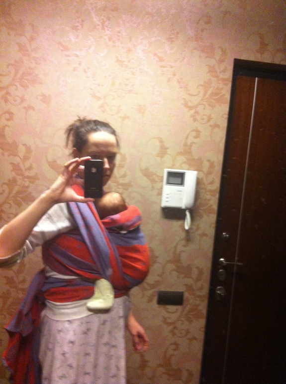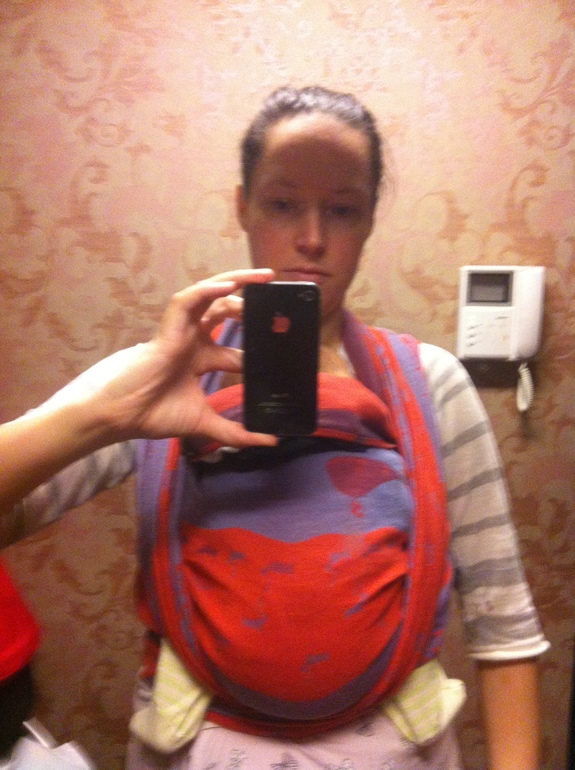 Ползунки натянулись ан пальчиках, карман стоит заправить глубоко между собой и малышом, дотянуть слабину ткани кармана — складки по спинке, перекрестие на своей спине делать пониже — слишком близко к шее, валик менее объемный — по длине шейного отдела малыша. Высота намотки — попа малыша на уровне Вашего пупка. Если шарф не стиран — постриайте, погладьте.