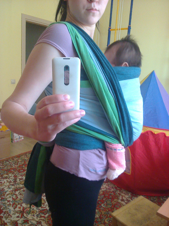 Вот два варианта: с расправленными полотнами и собранными. Во втором варианте почему-то особенно прямая спина получается. Ребенку 1,5 месяца.