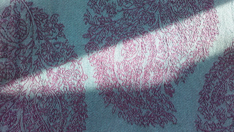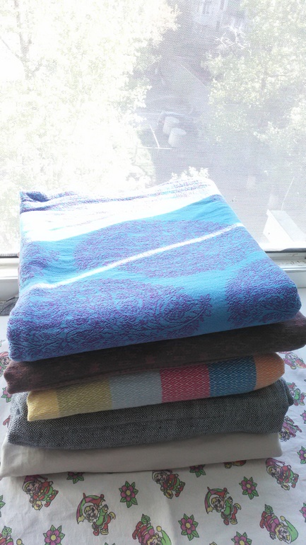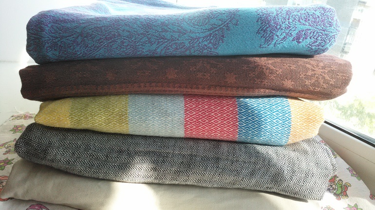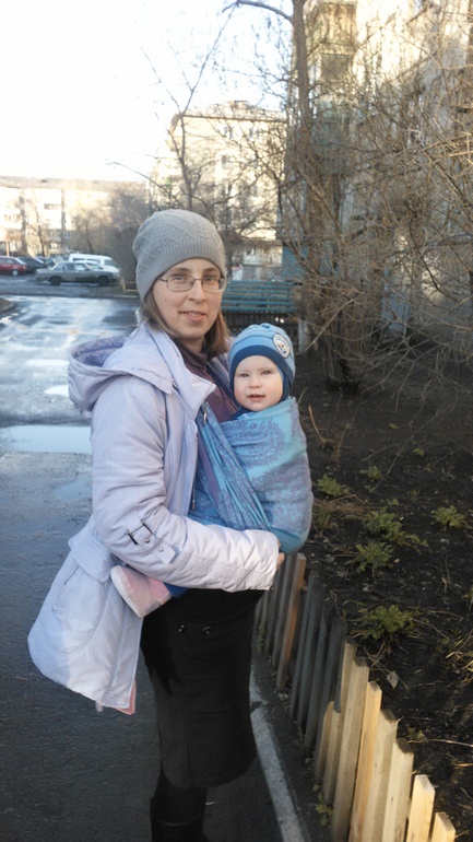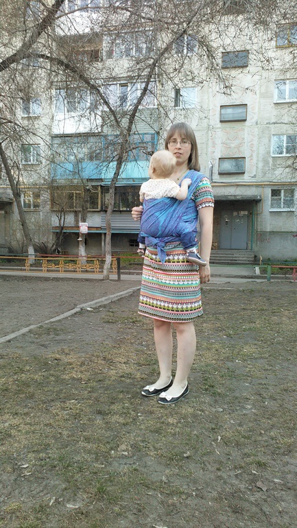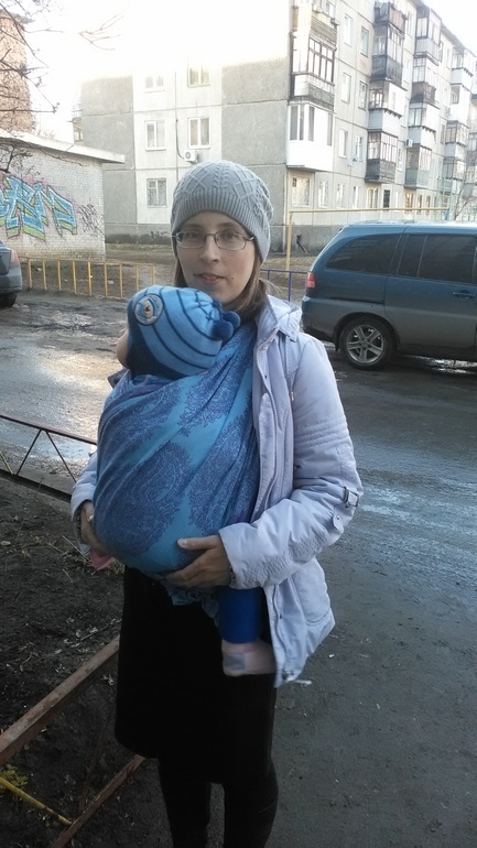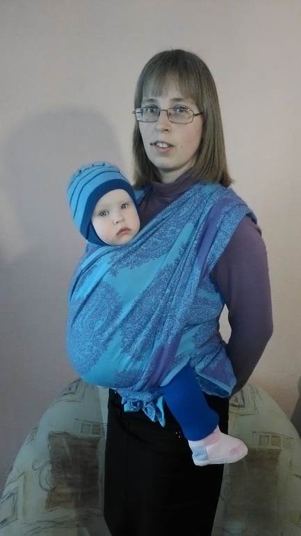 Здравствуйте,этот тест драйв у нас первый) Мы,это мама Юля,46 размер и дочка Соня почти 11 мес и вес 8700 кг. До этого сш,у нас был трикотажный,от мать ехидны тоненький хлопок,от мамс эра ромбы радуга алмазного плетения,хлопок,который мы и носили до приезда шарфа. Шарф в размере 6ка,но концы выводились вперед и завязывала их на самых концах. Но и на одном узле сзади хорошо держит. Шарф 100% хлопок,очень красивый с двух сторон,и синий,сиреневый мне очень нравится. Первая намотка и разочарование,плохо подтягивается,еле намотали кнк..,но не сдавались мы и после недели ежедневной носки на улицу по 1,5-2часа,шарфик изменился,помягчал и для спины и плеч вёл себя в намотке лучше,чем радуга ромбы,ещё у этого сш цепкость хорошая,за счёт рисунка,наверное. Но намотку надо тщательно расправлять и тогда шарф лучше несёт и плечи не страдают. Считаю,что этот сш можно от рождения и до кг 8...,не грузовоз..,наверняка со льном он был бы более грузовозным. К нам пришел ещё сш от нино япония шоколад со льном,вот он для тяжелых).Хотя плечи и спины у всех разные и ощущения тоже,это только моё мнение,кто же и в сск больших носит,а я вот нет,дома пробовала сск от мамс эра(носили с рождения)и не дольше 15минут.. И дальше фото.