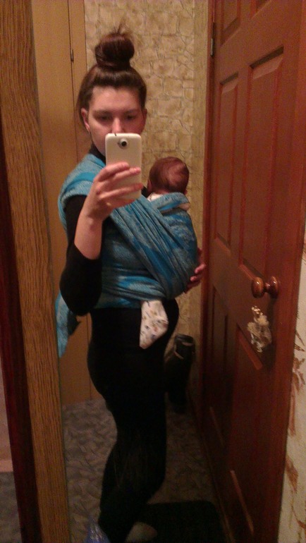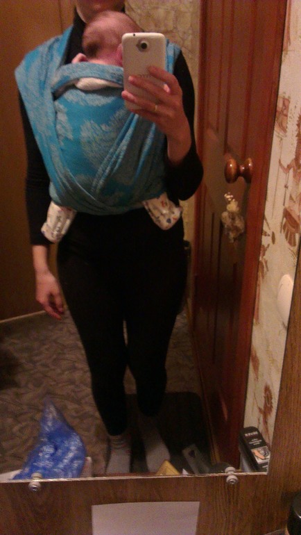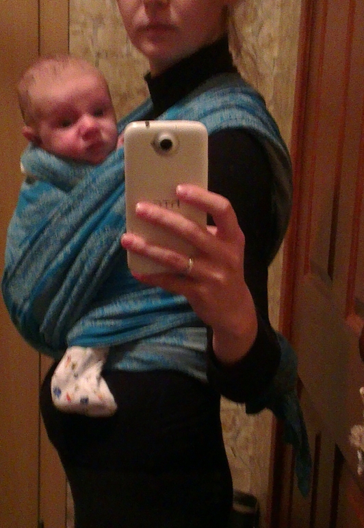 Шарф стирали?Прижимаете плечики малыша ладонью и подтягиваете верхнюю треть кармана с плечей.