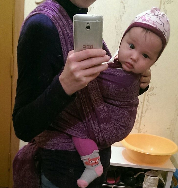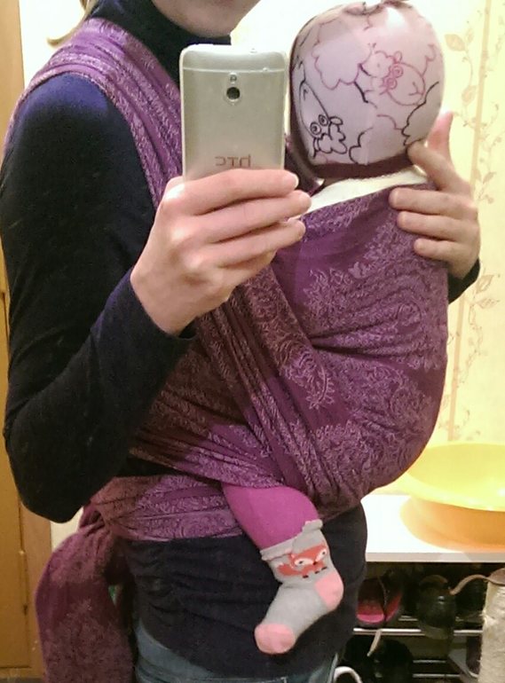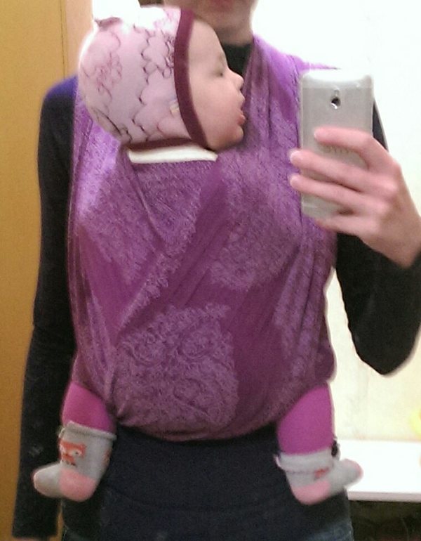 Спасибо! Дочка при намотке упирается в Меня руками и отклоняется назад. постараюсь поглубже заправить нижнюю треть, чтоб таз дальше был, чем плечи.