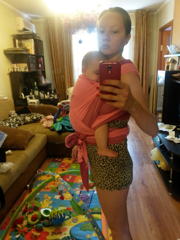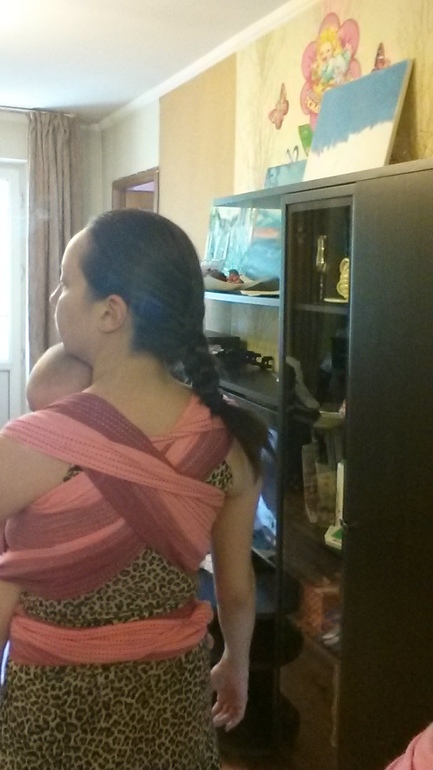 Максимально расправленные по спине полотна притягивают малыша ещё больше к вам)и создают равномерную поддержку вашей спине.