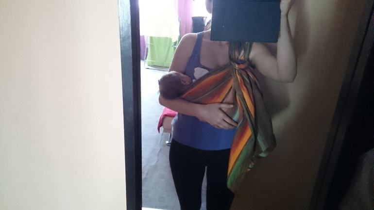 С кольцами быстрее одеть, если кормить... Он же часто еще ест, туда-сюда из шарфа неудобно и голова в шарфе заваливается у него, трудно мне одолеть слинги....