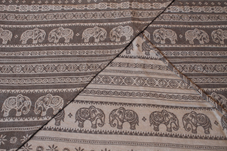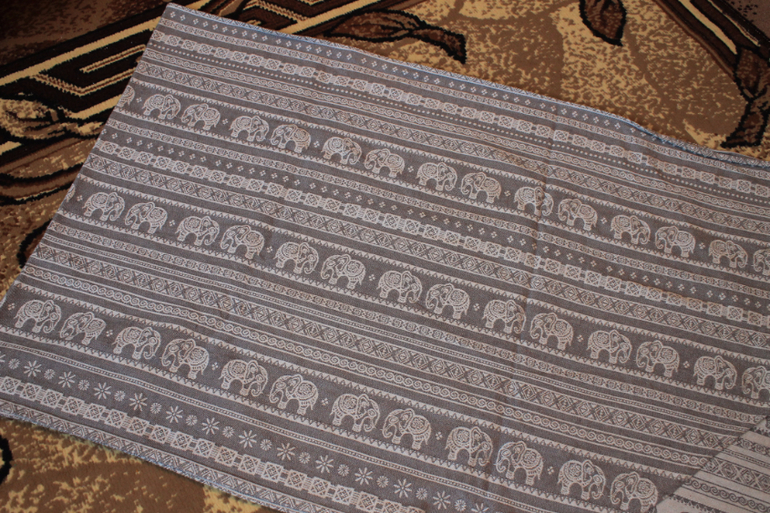 Внешне шарфик очень спокойный. Я бы предложила все-таки подшивать на обе стороны (но тогда слоны будут на спине ползти)))) Цвет приятный. Паттерн не мой вообще) Для меня в нем перебор элементов - мультяшные слоны, ромбики-цветочки-полосочки-загзаги)) Дальше немного картинок.