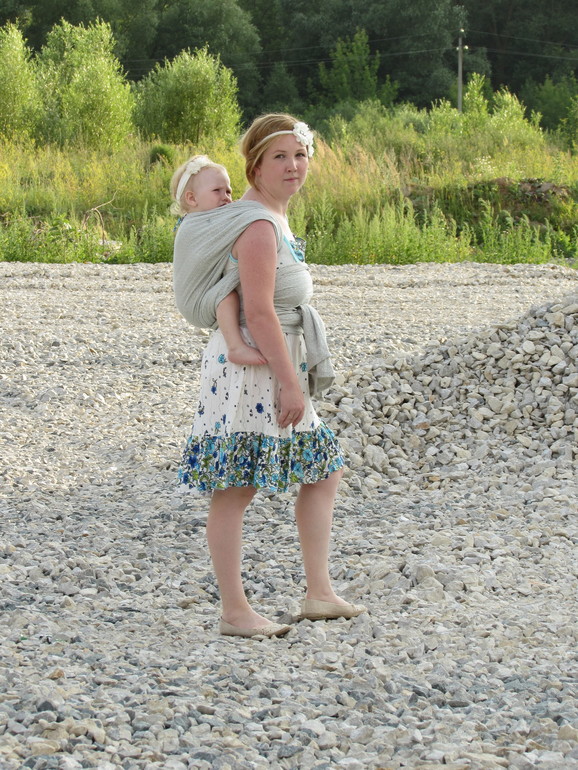 Когда я в том году впервые задумалась о тонком и грузовозном летнем шарфе, я неоднократно находила упоминания об этом слинге и он стал подарком к новому году. И, что удивительно, грел нас под пальто зимой и весной. Но всё таки главным он стал летом. Очень тонкий, мягкий, легкий и такой приятный на ощупь, после стирки стал блестеть на солнце и стал еще мягче. Гуляем в нём часами при температуре + 30 и нам не жарко, при правильной намотке 12 кг растворяются. Обязательно возьмём его на море, думаю для прогулки по горам, он будет отличным помощником.