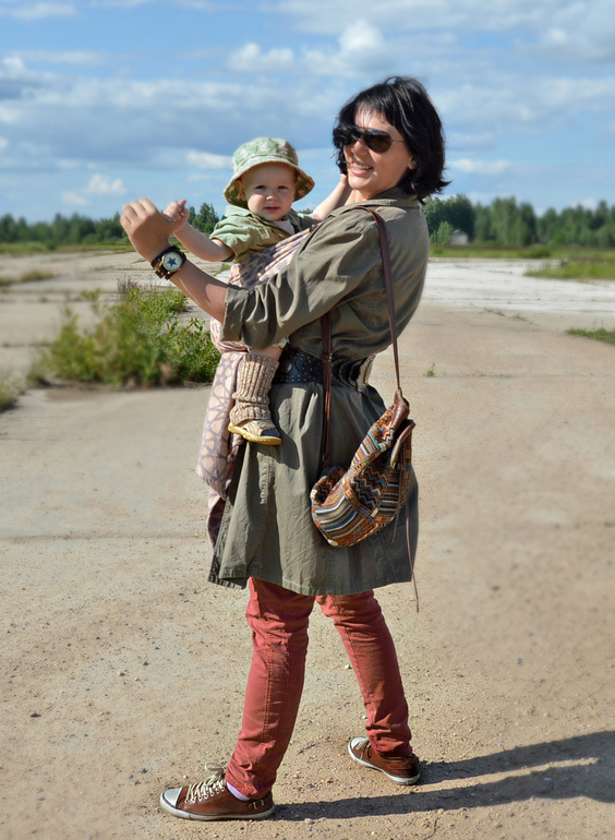 Доброго дня, дорогие слингосообщницы! Меня зовут Маша, сына Сережа, и мы хотим показать вам наш второй конкурсный образ в стиле милитари.Оказалось, что для того чтобы образ сложился, нужно было всего лишь собрать вместе все мои любимые вещи. Очень пригодился длинный китель защитного цвета, ну и какое милитари без массивных аксессуаров, отлично вписались крупные часы со звездой на широком кожаном ремне и широкий пояс с огромной пряжкой. А теперь о шарфе: он прекрасен )), а если по существу: он прекрасен)) это Мокошь Гирих карамель, и я безмерно счастлива от того, что мой поиск идеала длинною почти в год, привел меня к нему. Пластичный, рыхлый, обнимательный, грузовозный и невероятно, сдержанно красивый. Вообще паттерн Гирих мне нравится своей универсальностью, он не крупный, не мелкий, он как раз такой какой нужен, наверное поэтому хорошо смотрится во всех расцветках и подходит практически ко всему. Нравится и лицо и изнанка, свою карамель я чаще всего мотаю изнанкой, она выглядит более темной.