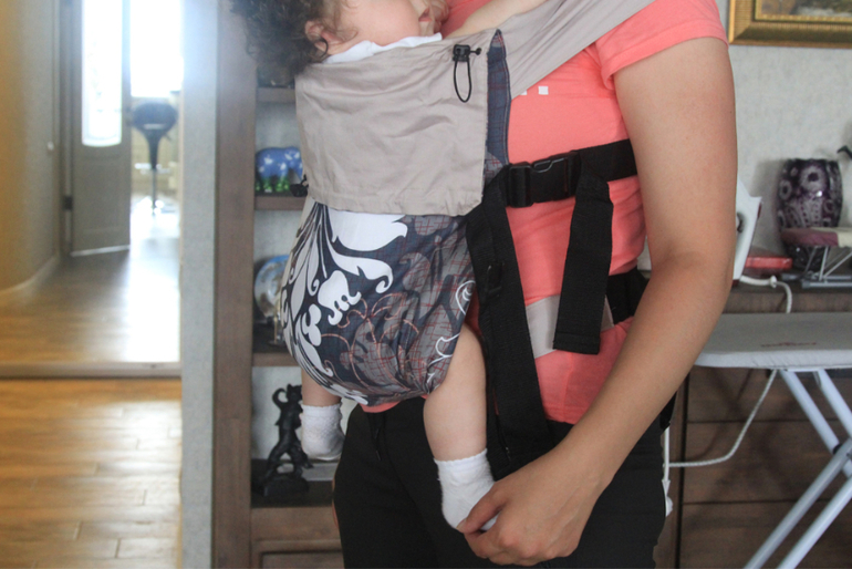 У фаст-слинга ограниченная регулировка.Вам стоит лямки расположить на плечах так, чтобы подтянуть края спинки, которые, в свою очередь, смогут подтянуть колени повыше.Пояс можно попробовать застегнуть фартуком и плотнее. Дать попе провиснуть в кармане. Сейчас пока спина выпрямляется, попа поднята вверх.