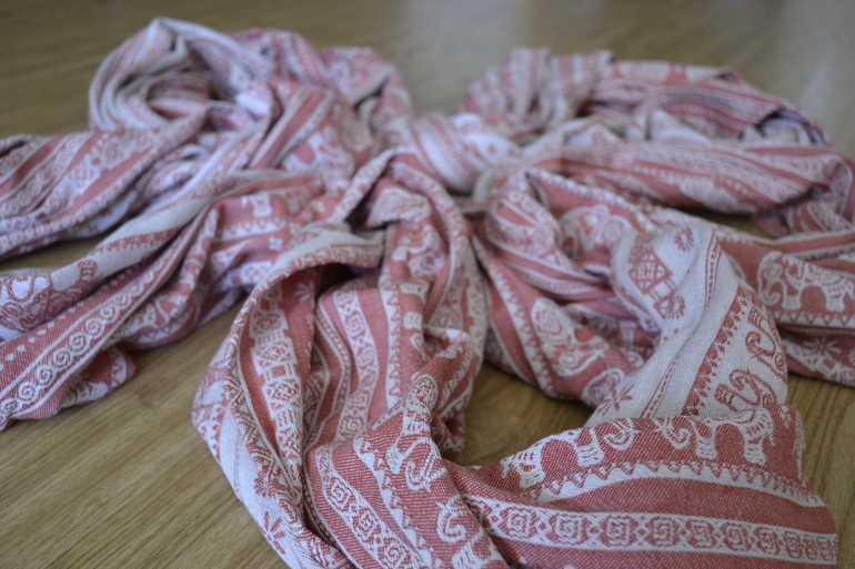 Оговорюсь сразу: я не слингоманьяк. И в тканях тоже не особенно разбираюсь. Скажем так, шерсть от шелка отличу, а уж задачки посложней - это не ко мне. Поэтому на ощупь разницы между моим слингом - хлопок со льном - и Elephant Orange, сотканным только из хлопка жаккардового плетения, я не заметила.