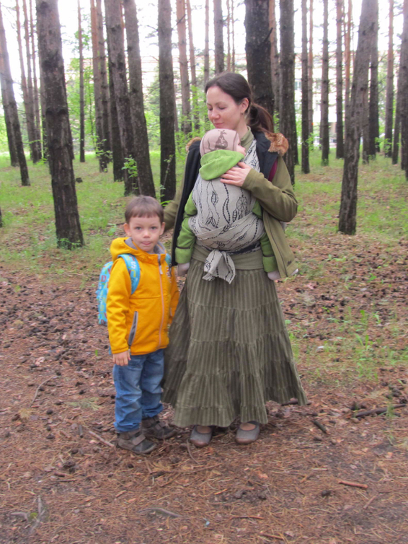Этот май-слинг мы несколько раз носили в течение двух часов без перерыва, в том числе и в общественном транспорте со спящим ребёнком. Мне всё же недоставало возможности гибкой регулировки полотен на плечах (я фанат шарфов, так уж сложилось ;) А вот фронтальная намотка получается комфортнее в области маминой талии по сравнению с проложенным поясом эрго-рюкзака. Это, несомненно плюс, особенно для тех, кто подолгу ездит в автобусе (т.е. сидит с ребёнком в слинге).