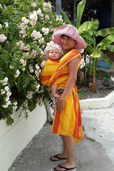 Получив долгожданный слинг мы пошли на море. Hoppediz Nairobi обнимателен и мягок, немного скользит, но держуч. Шарф мягко обнимал мои плечи и малышку, дойдя до моря, она в нем сразу уснула.
