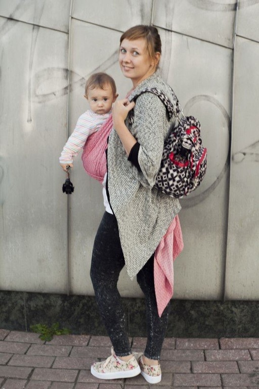 Это первый день - образ строгий, днем мы ездили на встречи по моей работе. Обычно, пока я еду в лифте, я подтягиваю намотку, но с этим шарфиком, подтягивать почти не пришлось. В этот день мы с мужем немного разминулись и мне пришлось его догонять. Пока я бежала, Ника сладко спала. Шарф крепко прижимал ее и не давал разболтать намотку.