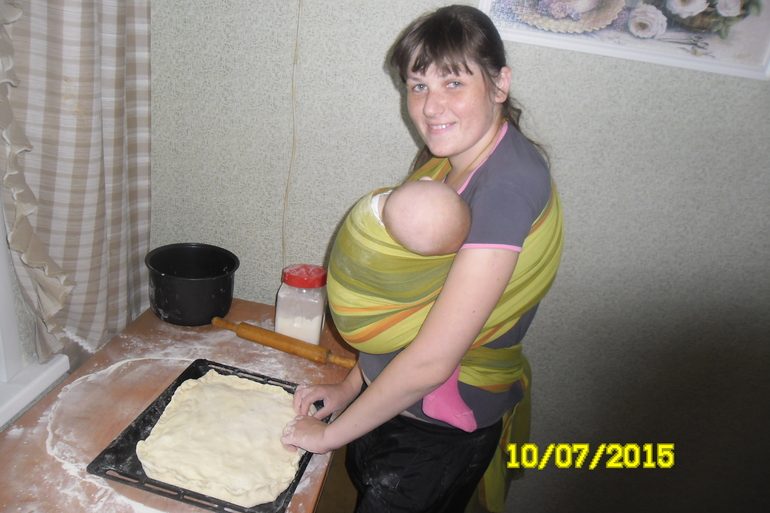 К чему это я? Ах, да... В эту неделю я решила баловать своих домашних выпечкой. Сначала мы с дочей налепили беляшей. Жарила я их конечно же одна, помня о правилах безопасности в слинге . Беляши - вещь крайне недолговечная и исчезли она за двое суток. Через день у меня созрела мысль испечь пироги. Дома было холодно, а работающая духовка отлично выполняет роль обогревателя. Танюша мирно посапывала на мне все время, пока я готовила начинку и лепила пироги.
