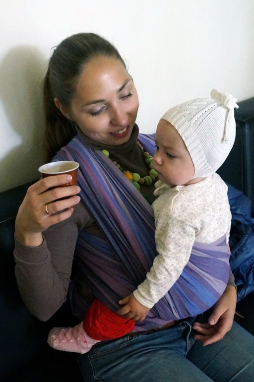 Насмотревшись на нас, наш фотограф и наша любимая Даша, тоже захотела примерить на себя слинг... Примотались и... дочка там с удовольствием заснула, поэтому бонусом наша Слинготётя... А фиолетовый все-таки я очень люблю, это у нас дома в фиолетовой гостиной.