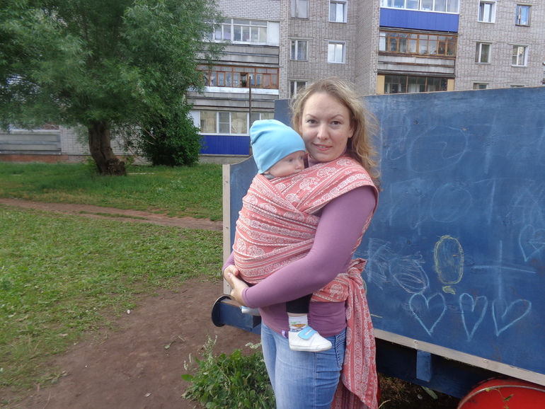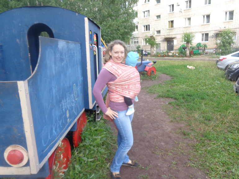 Итак, мотать слинг, я уже попробовала, дети проснулись после дневного сна, и мы отправляемся всей семьей на прогулку, Младшенький в слинге! Полуторачасовая прогулка прошла на ура, спина и плечи не болят совсем(а это для меня существенно), ребенок был доволен(несмотря на все огрехи намотки), погода была ветреная и прохладная,но в шарфе нам было очень комфортно - он достаточно плотный и был для нас, как дополнительная кофточка!