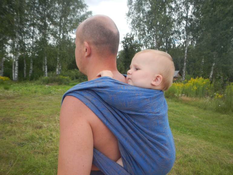 Я редко ношу шарфы в такой длине и не сразу сообразила, в каких намотках его носить. Опробовала ребозо дома и приятно удивилась, что шарф держит как прибили. На встрече опробовала новую для меня намотку - полу КНК. И внезапно в процессе намотки дочка уснула. 2 часа 9,5 кг на 1 плече - полет нормальный. Спина даже не пискнула, намотка никуда не уехала.