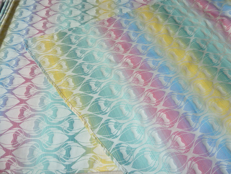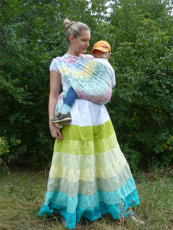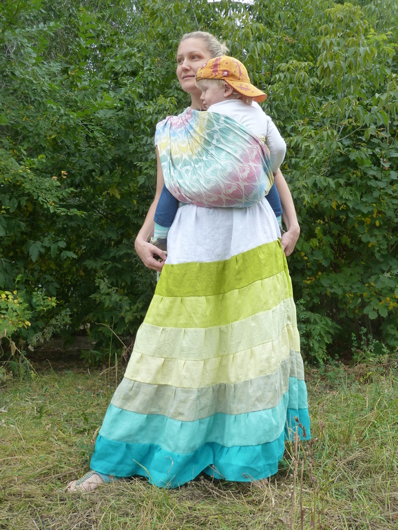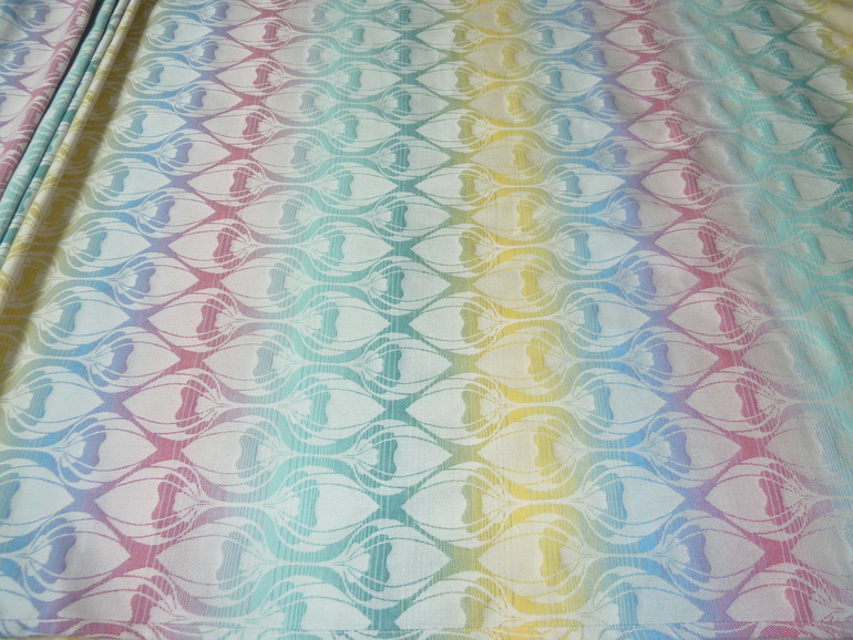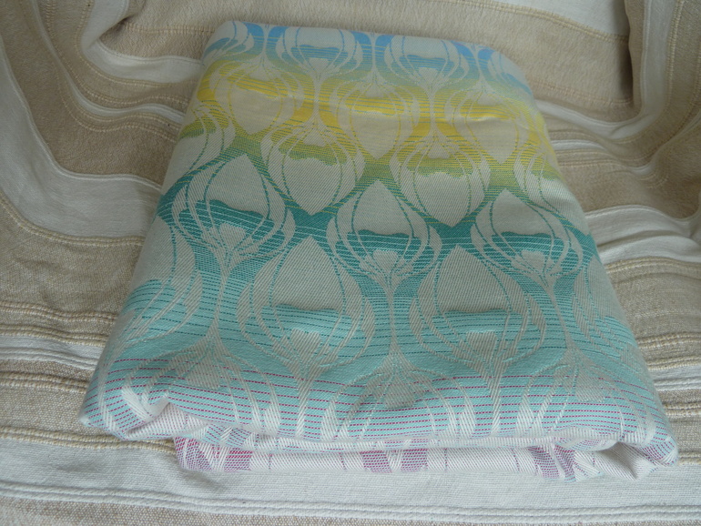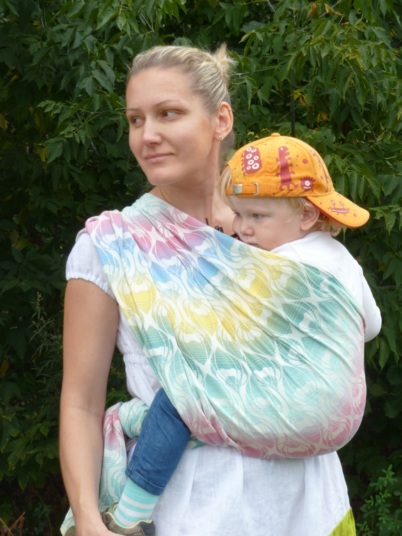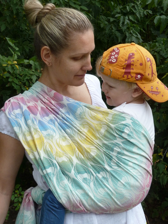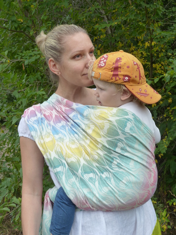 Радужный Ляфлёр по мне тонкий. Первая стирка прибавила шарфу обнимательности и пластичности. Мотается и подтягивается легко. Универсален, подойдёт и младенчику и тоддлеру. Моего кабанчика о 18-ти кг несёт отлично, никуда не врезается.