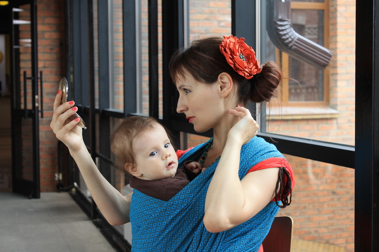 Что касается нематериальной стороны дела. Меня поразила одна простая вещь, которая, я уверена, знакома многим мамам - оказывается довольно трудным просто взять и уделить время себе: подобрать наряды, бижутерию, поухаживать за волосами и ногтями, продумать макияж. Все это мы вроде бы умеем и много раз делали когда-то прежде, но в водовороте обычной мамской жизни вечно не находим достаточно времени. Что же тут поразительного, кажется на первый взглдяд? Проще надеть джинсы и балетки, собрать хвост, намотать слинг и вуа-ля! Ан нет! Показалось мне то, что это «проще» - всего лишь ширма, которая скрывает неумение\нежелание уделить время себе, своей красоте, своему самоощущению. Этого не намажешь на хлеб старшему, это не поможет убраться в доме быстрее, не сделает эффективнее фриланс. Однако каждая женщина ощущает себя совсем иначе, когда сделает новую прическу, которая ей идет, маникюр, примерит новое платье и так далее. Рассуждения об этом давно стали общим местом. Все эти бесполезные, на первый взгляд, заботы делают женщину счастливее, веселее. А что может быть лучше счастливой мамы рядом с малышом? Mom is happy - everybody is happy, не так ли? Следуя этой простой логике нам просто жизненно важно уделять время себе - платьям и новым серьгам, макияжу и стрижке и всему такому прочему. Но что же мешает? Почему слинги зачастую используются, чтобы побольше можно было успеть (ключевое слово - «побольше»), и подчас означает сильнее упахаться, а совсем редко надеваются как стильный аксессуар, который не только несет ребенка, но и способен, при правильном подходе, украсить саму маму? Почему мамины глаза красятся только в крайнем случае, на выход, хотя кому не поднимает настроение красивый макияж? А ведь миллион статей написано на эту тему, сто раз советовано и проверено, что если мы видим с самого утра в зеркале то, что нам нравится, внутреннее состояние меняется…