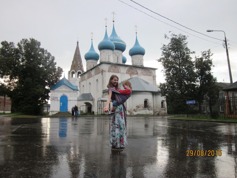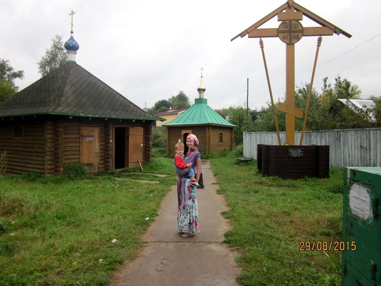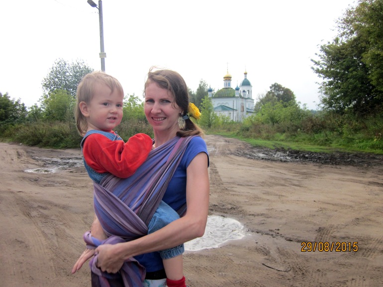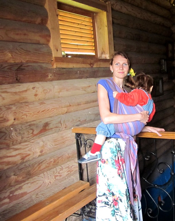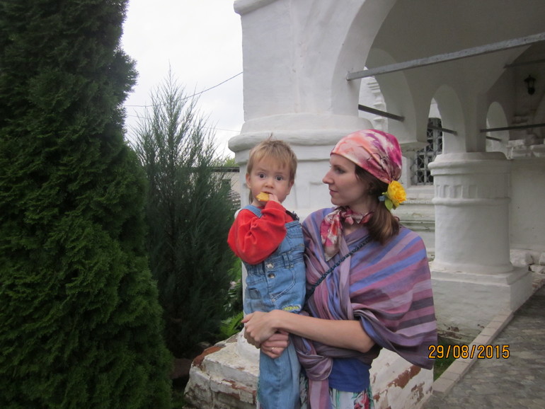 Примотавшись, сходили на службу в монастырь. Малец долго не выдержал без бега и печеньки. Пришлось снова его вытащить из слинга, благо намотка была простой крест, которая легко превращается в кофточку.