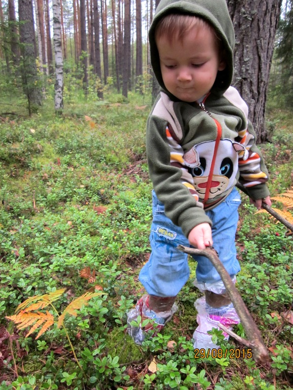 Наше путешествие началось с приезда к бабушке и дедушке в п.Мулино Нижегородской области. Поселок этот - военный городок, окруженный сосновыми лесами. Первое, что мы сделали, так это отправились в поход за ягодами. Сынок наотрез отказался сидеть в слинге. Это и понятно! Лес как ящик с сокровищами: куча рыцарских мечей - палок, кидательных снарядов - шишек и вкуснецкого провианта - черники и брусники.
