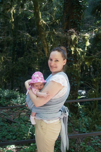 Когда очередь дошла и до нас, я несказанно была рада получить жемчужный Мэнкэрэ! Первое впечатление было: «О! Какой он большой и длинный… и плотный…». Мои представления о качестве ткани слингов несколько различались с реальностью ))) Конечно же я сразу стала его наматывать, сначала опробовала его с плюшевым мишкой, а уж затем с дочкой!!! И вторым впечатлением было - Боже, какой он действительно обнимательный!!! С каждым наматыванием, ощущая в руках уют и гармонию от слинга, все больше и больше приобретала уверенность в движениях, все меньше и меньше волновалась… Ткань действительно крепко, но в то же время заботливо и нежно удерживала мою малышку, не признающую ни чьи руки, кроме маминых. Намотав первый раз и усадив в карман Варюшку, моя спина почувствовала чудесное облегчение, и мы «на крыльях» пошли хвалиться в гости к подруге, живущей по соседству ))) Выпили чаю с творожными булочками и удовлетворенные вернулись домой… Я поняла, что можно смело рассчитывать наконец-то на прогулку в тисо-самшитовую рощу, всю беременность я о ней мечтала, но к сожалению, суета рабочих будней отвлекала от мечтательного времяпрепровождении!!!