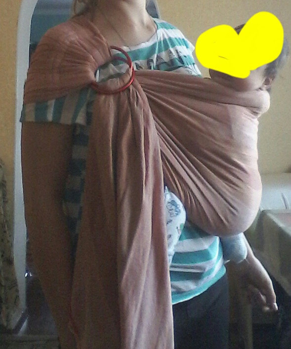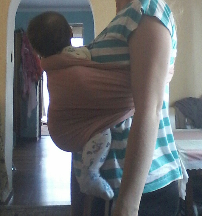 Ребенок, на мой взгляд, очень низко. Плечо слинга слишком низко по руке, плечи малыша отставлены.