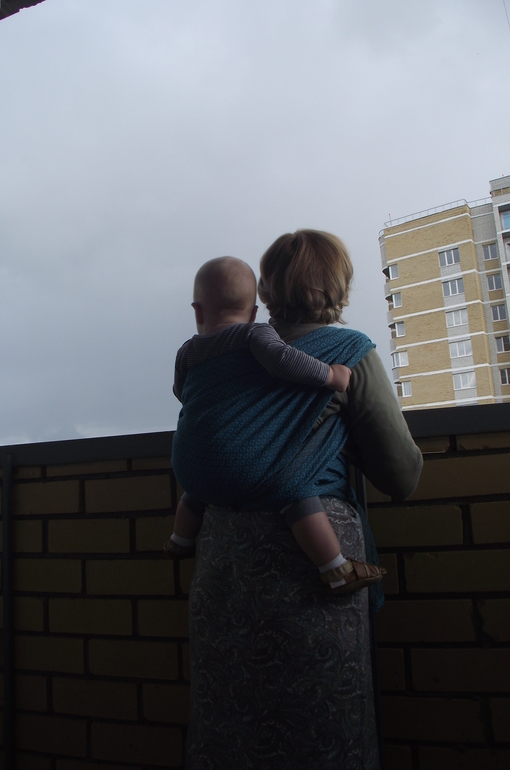 Намотали мы шарфик и собрались на прогулку. Но неожиданно пошел дождь и поэтому некоторое время мы взирали на природу-погоду с высоты своего балкона.