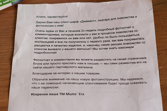 Единственная ложка дегтя в этой бочке с медом, пожалуй, первая фраза послания. "Дарим Вам наш слинг-шарф", все-таки, значит несколько иное. Было бы лучше заменить ее на "Дарим возможность протестировать...".