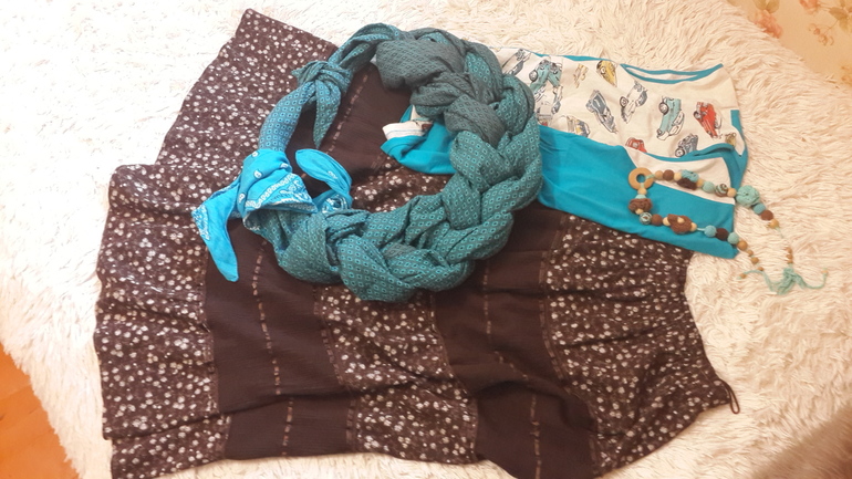 озорную на-погулять (кормительный топ с машинками и бирюзовой спиной "Айлавмам", весёлая бюджетная юбка, бандана в тон - возможно, на ребёнке, опять же, бусики)
