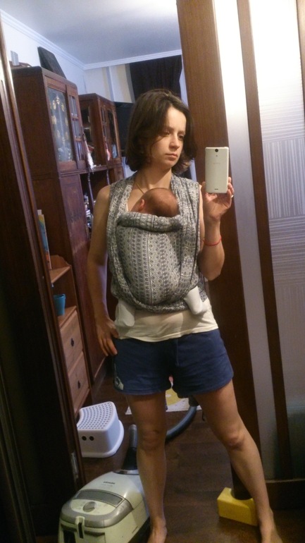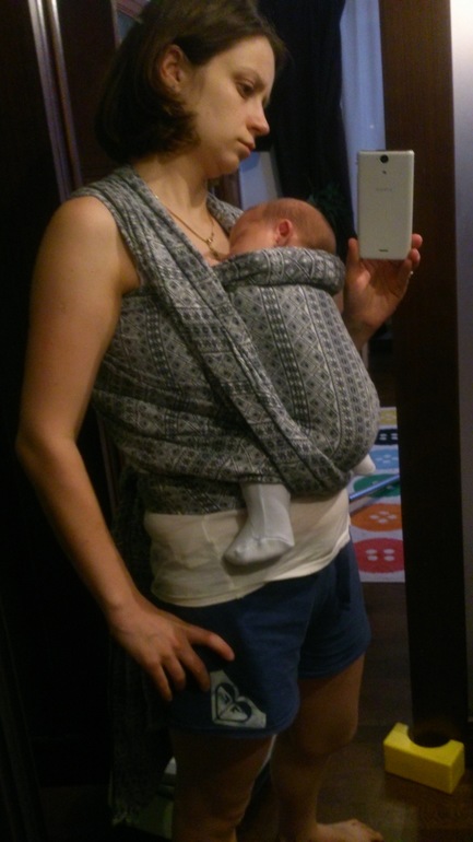 Человеку 3 недели, вес не знаю сейчас какой. Наматывалась по старой памяти (старшую носила не много совсем, поэтому ассом себя не чувствую ни разу; опыта ношения новорожденного вообще нет).