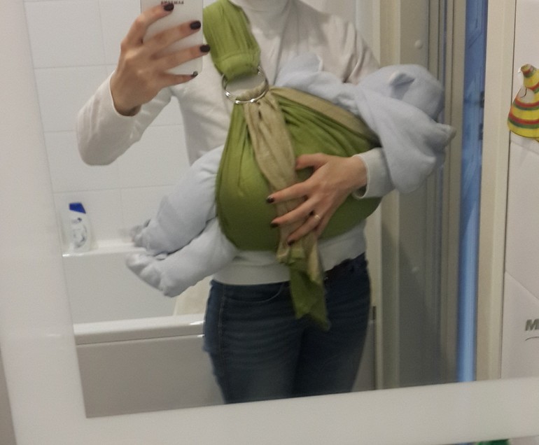 Носят и в год в колыбельке, дело не в этом. Расправьте хорошо ткань от головы до подколенок, нижний борт глубоко между вами засунуть, кольца сместить к ключице. Малыш лежит на полубочку. Хорошие короткие видео у Нины Зайченко.