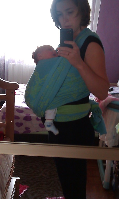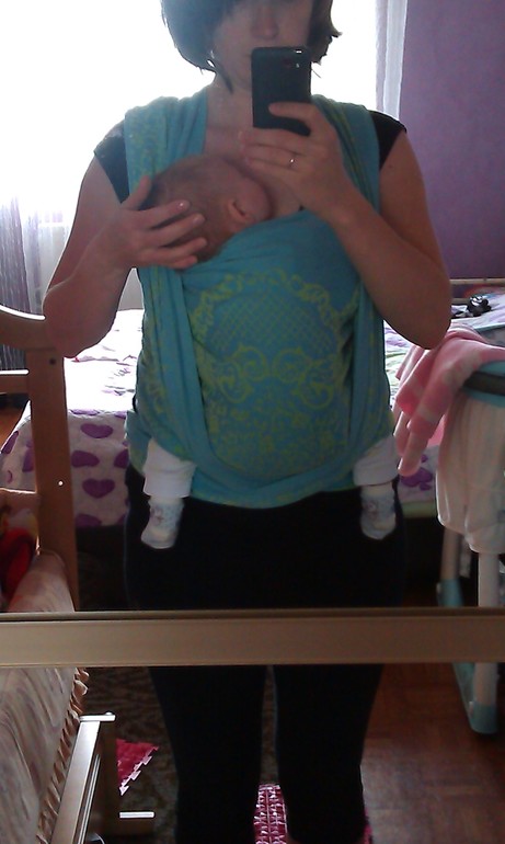 Учимся носитьДевочки, всем привет! Посмотрите, как вам намотка, покритикуйте, не низко ли ребенок? Правда, он у меня еще в шине-распорке тут, под попу ткань не получается сильно загнать.Он у меня в такой положении умудрился покушать.