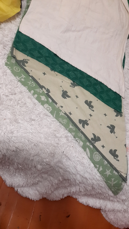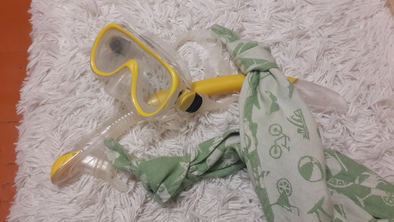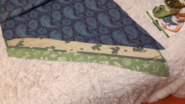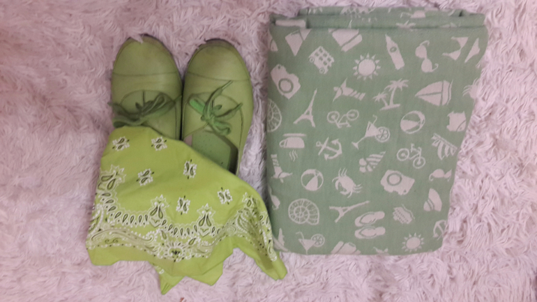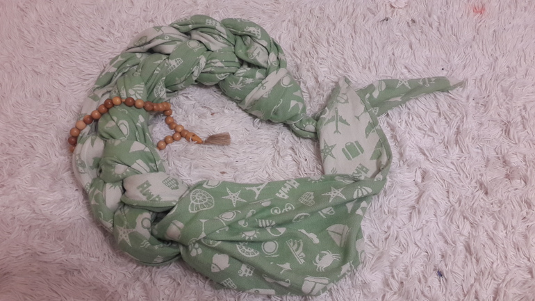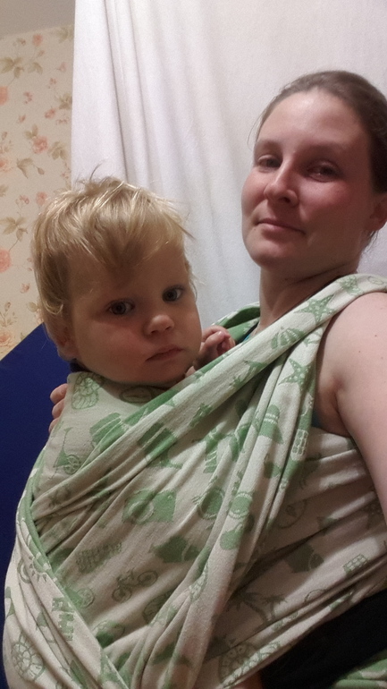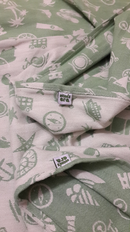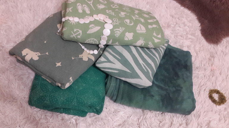 Шарф приехал разношенным до степени если не младенчиковой пелёночки, то что-то около того. Слингопассажир мой уже перевалил за 16 месяцев и 13 кг, так что, достав слинг из коробки, я поняла, что мотаться не буду. во-первых, не унесёт, во-вторых, не мой цвет и паттерн. (кстати, у меня в стопке порядка пяти мамсэровских шарфов, ещё за парой-тройкой паттернв охочусь.. думаю, это говорит о дизайнерской мощи ТМ в целом). До встречи с "холидей" я была уверена, что зелёные шарфы - моя слабость. ан, нет, зелёный-зелёному рознь