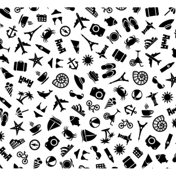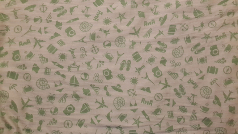 Надо сказать, что паттерн весёленький. и очень богатый. я пыталась сосчитать, сколько там всего изображено: бикини, бигбен, компас, самолёт, чемодан, шлёпки, мяч, пальма, краб, мороженка, коктейль, фотоаппарат, ракушка, чашка чая (или кофе?), якорь, пароход, башня, тарелка, английский двухэтажный автобус (даблбасс), эйфелева башня, театр, велосипед, статуя Христа, зонтик, рыба, магазин, ещё одна башня, солнце (как же без него!?), шляпа, парусник, морская звезда, дельфин... 33.